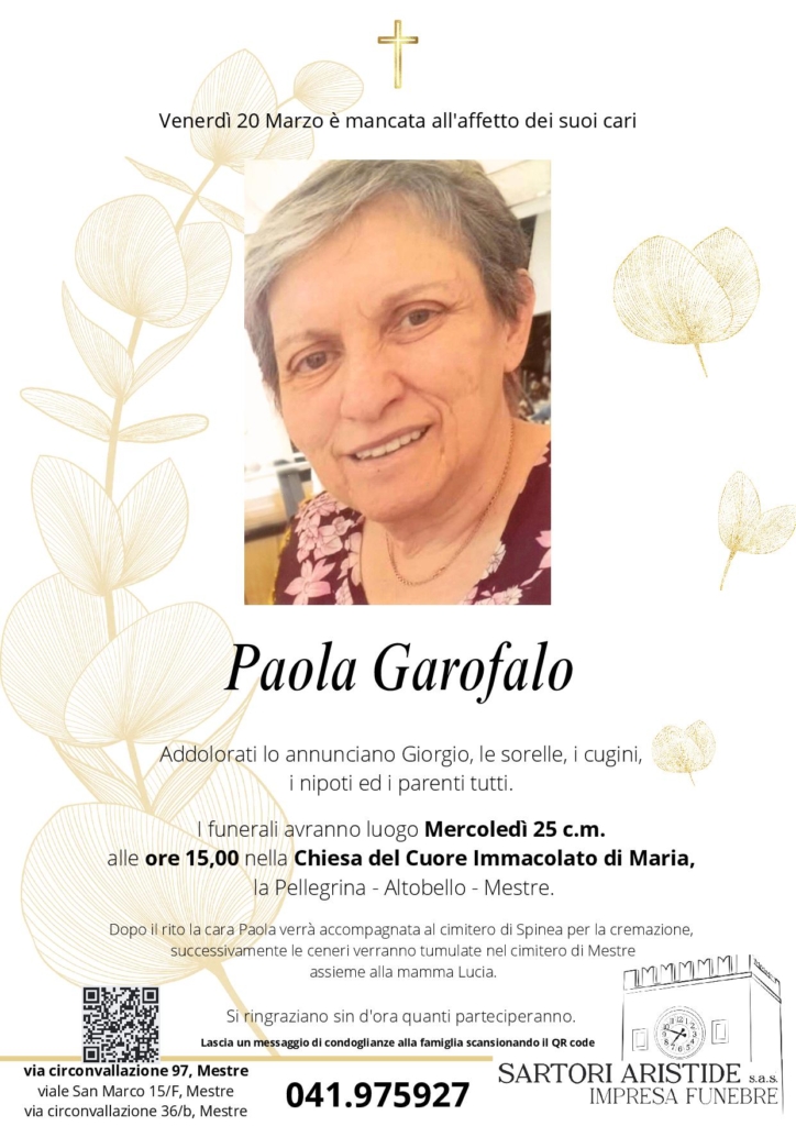 Ciao cara zia Paola , porteremo sempre con te l esempio di una. grande Guerriera … veglia e sorreggi da lassù’ chi tanto ti ha amato in questa terra e sempre ti amerà . Ovunque tu sia .. fai buon viaggio e grazie per tutto . Martina Liliana ,e Dario Stocco